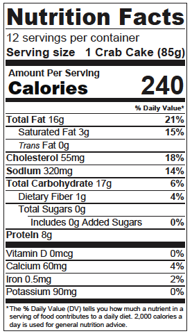 The crab cakes contained in this package are precooked and should be heated through to an internal temperature of 160°F. Depending on the number of portions prepared and oven temperature variances, heating times may need adjustment.